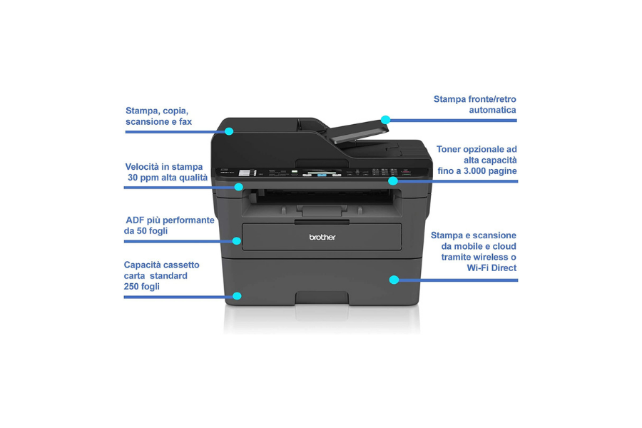 Dotato di display LCD 2 linee per 16 caratteri e ADF da 50 fogli. Stampa e scansione da dispositivi mobile e cloud . Interfaccia USB 2.0 Hi-Speed. Toner opzionale ad alta capacità TN-2420 da 3.000 pagine.